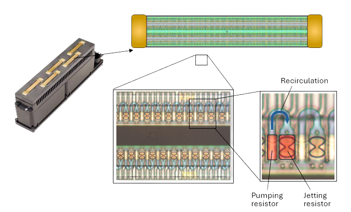 Para evitar la evaporación del disolvente, se utiliza la recirculación de tinta. Este método mantiene la tinta fluyendo continuamente alrededor de la boquilla, asegurando que permanezca fresca y bien mezclada, incluso durante periodos de inactividad. Cada boquilla cuenta con su propia bomba pequeña en lugar de una bomba grande. La tinta fluye a través de pequeños circuitos en forma de U conectados a un depósito grande. Un lado tiene una resistencia térmica con una boquilla que expulsa la tinta, mientras que el otro lado tiene una resistencia similar que crea un flujo circular de tinta, actuando como una pequeña bomba.